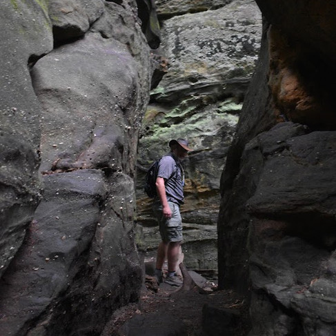I walked over to where Dave was standing on the edge of rock overhang to see where he was gesturing. Sure enough, below us was a narrow path between two rock walls. It was not as long or winding as the ones we explored in Arizona but still...exciting!